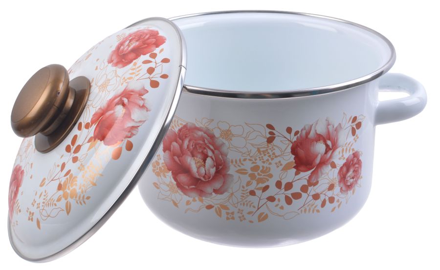 Кастрюля эм. 2л, эм. крышка с деколью и пласт. кнопкой, цилиндр с ободком "Пионы" белая