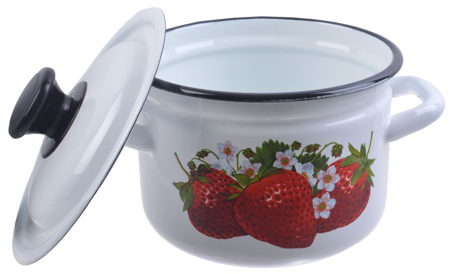 Кастрюля эм. 2л, эм. крышка с пласт. кнопкой, цилиндр конусный борт, деколь, белая (4)