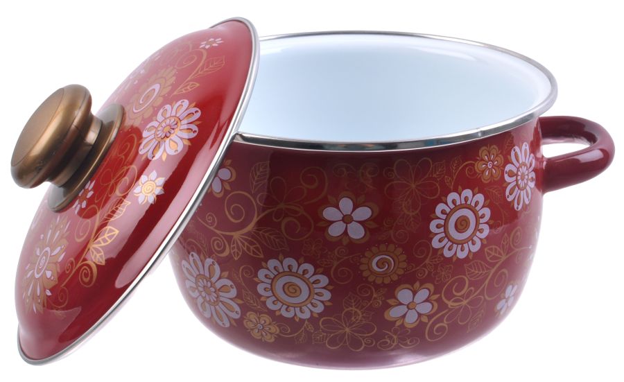 Кастрюля эм. 2л, эм. крышка с деколью и пласт. кнопкой, сфера с ободком "Золотой узор" вишнёвая