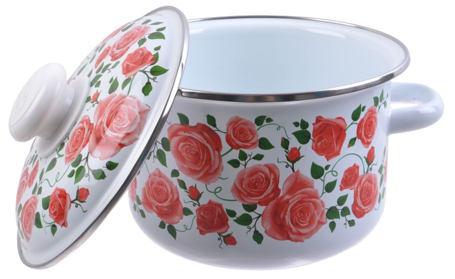 Кастрюля эм. 2л, эм. крышка с деколью и пласт. кнопкой, цилиндр с ободком "Роза плетистая" белая
