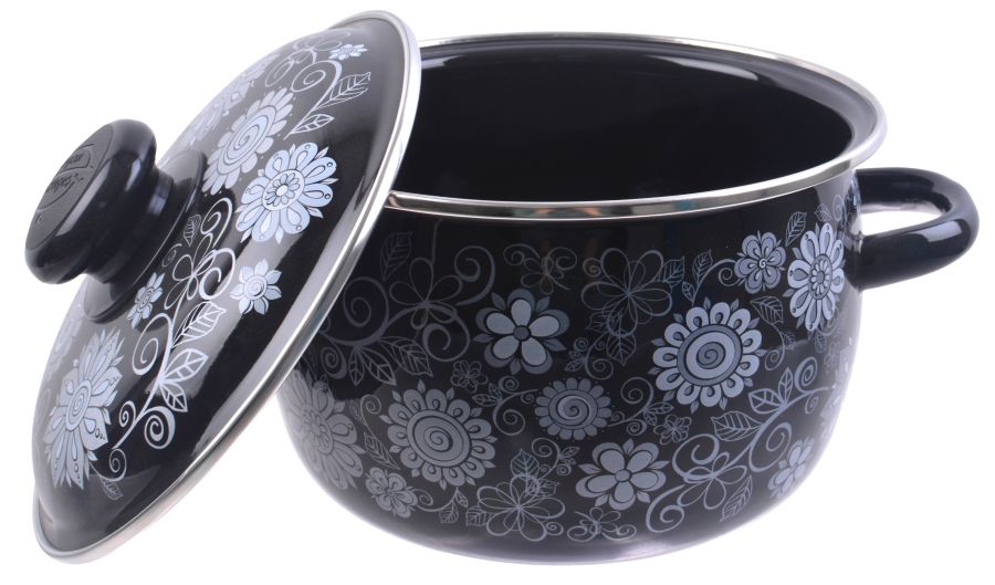 Кастрюля эм. 2л, эм. крышка с деколью и пласт. кнопкой, сфера с ободком "Серебряный узор" черная