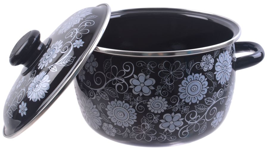 Кастрюля эм. 3л, эм. крышка с деколью и пласт. кнопкой, сфера с ободком "Серебряный узор" черная