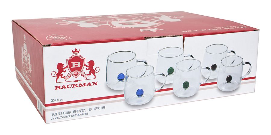 Набор кружек 6шт 250мл стекло, цветной декор на дне (8)