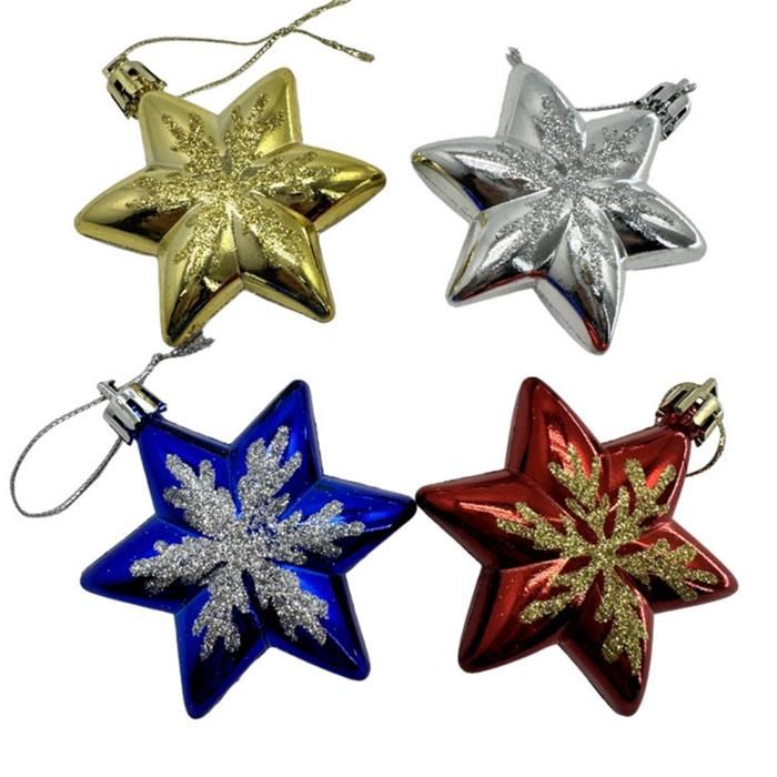 Елочное украшение Звезда с разноцветная со снежинкой 6см 4шт красные/блестки XD-154