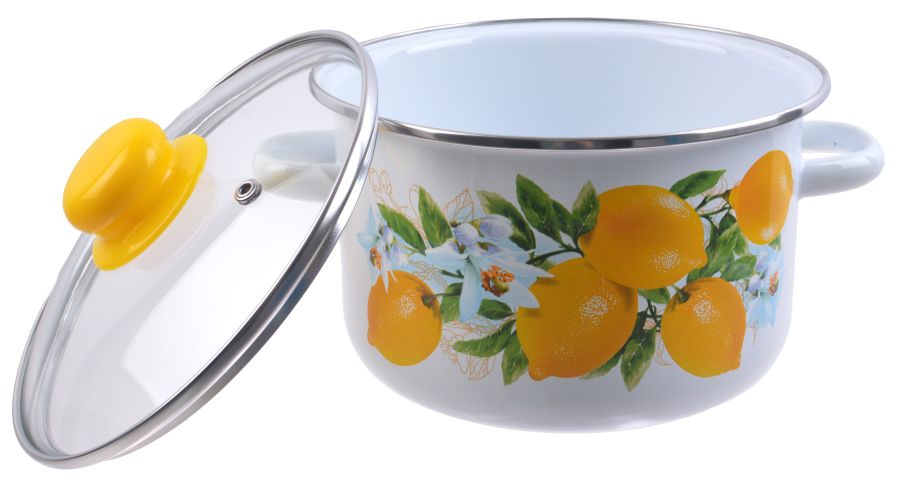 Кастрюля эм. 3л, ст. крышка с пласт. кнопкой с ободком, цилиндр "Лимоны" белая
