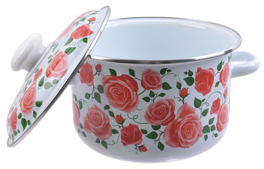 Кастрюля эм. 3л, эм. крышка с деколью и пласт. кнопкой, цилиндр с ободком "Роза плетистая" белая