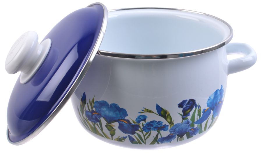 Кастрюля эм. 2л, эм. крышка кобальтовая с пласт. кнопкой, сфера с ободком "Ирисы" белая