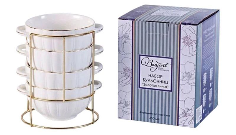 Набор бульонниц 4шт 650мл фарфор "Золотая линия" на мет. подставке (6)