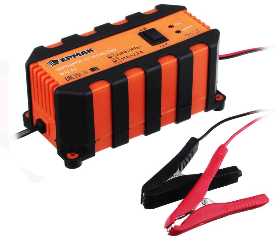 Зарядное устройство импульсное, автомат, 2,7А, 6В/12В, заряжаемые АКБ 5-50Ач, зажимы "ЕРМАК"