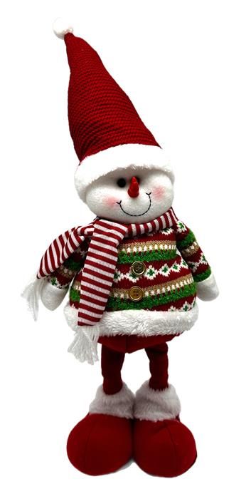 Снеговик 45см в красной вязаной шубке с пайетками, с шарфиком, с выдвигающимися ногами