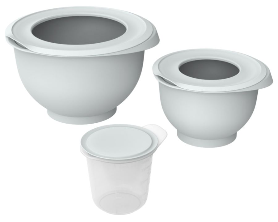 Набор мисок для миксера пласт. 3шт (0,7л; 2,1л; 5,3л), мерн.стакан и крышки "Кули" (№1) серые (12)