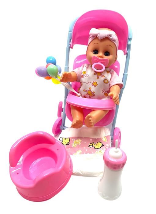 Кукла-пупс девочка в коляске с бутылкой, соской, аксес. 26*16см сетка ZY1-5N