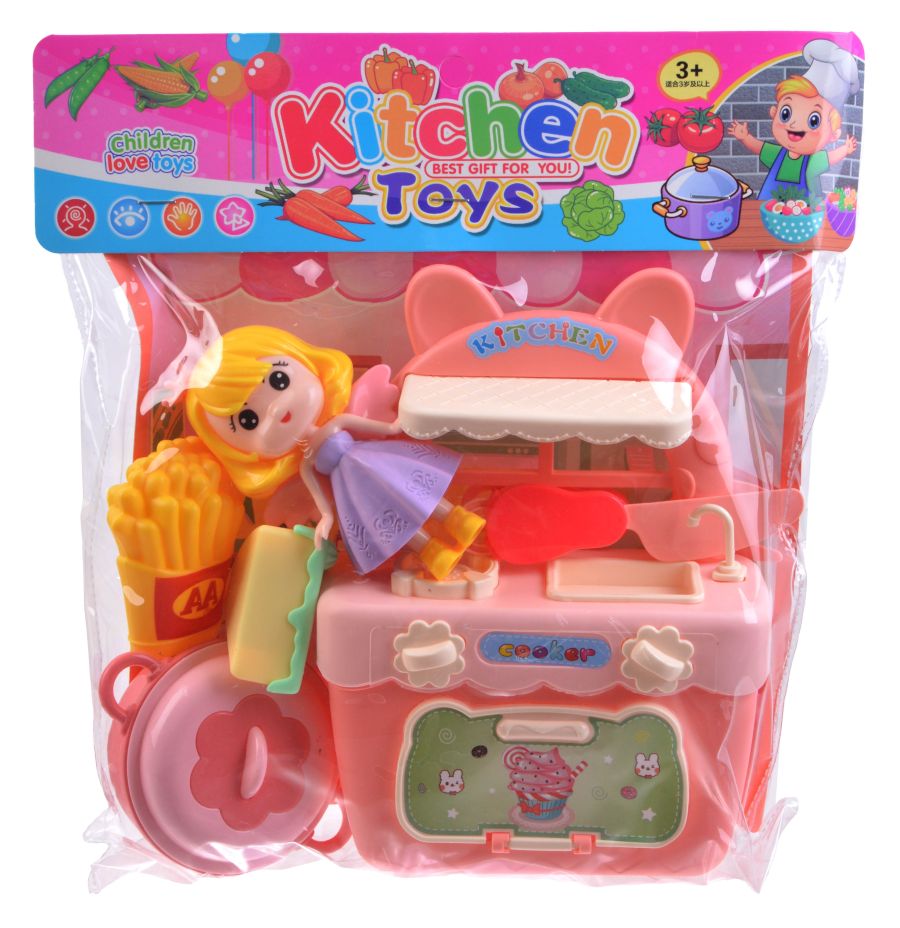 Кукла (пласт.) + кухонная плита + аксессуары 25*21см/блистер 8018-10