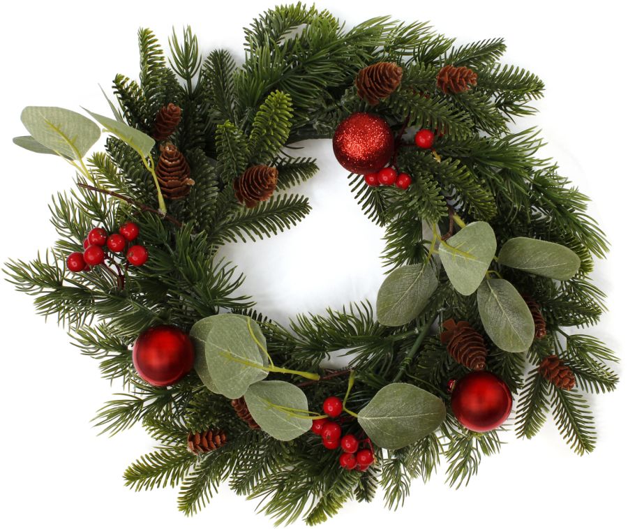 Венок новогодний 38*10см Праздничный с ягодами, листьями, шишками и елочными шарами