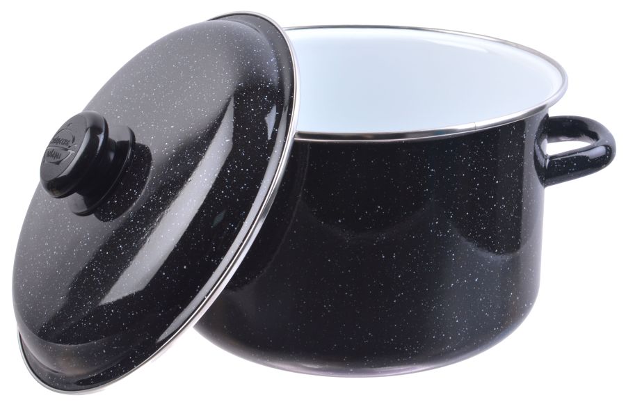 Кастрюля эм. 5,5л, эм. крышка с пласт. кнопкой, цилиндр с ободком, белая внутри, цвет черн. рябч (4)