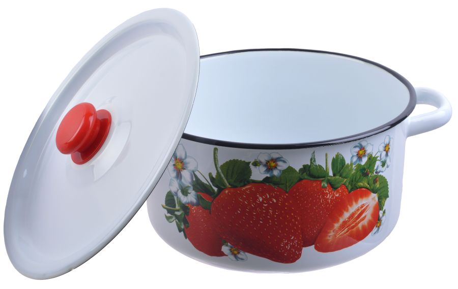 Кастрюля эм. 5,5л, широкая, эм. крышка с пласт.кнопкой, деколь микс, белая