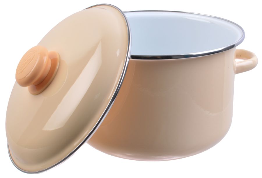 Кастрюля эм. 4л, эм. крышка с пласт. кнопкой, цилиндр с ободком, белая внутри, цвет слон. кость (8)