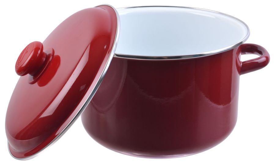 Кастрюля эм. 5,5л, эм. крышка с пласт. кнопкой, цилиндр с ободком, белая внутри, цвет вишня (4)