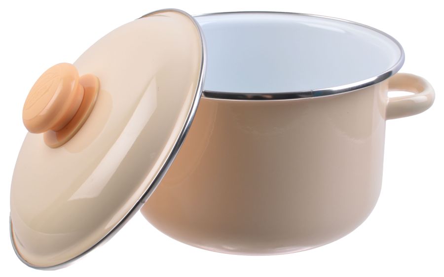 Кастрюля эм. 3л, эм. крышка с пласт. кнопкой, цилиндр с ободком, белая внутри, цвет слон. кость (6)