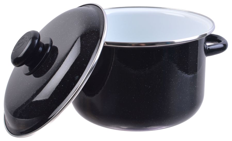 Кастрюля эм. 3л, эм. крышка с пласт. кнопкой, цилиндр с ободком, белая внутри, цвет черн. рябчик (6)