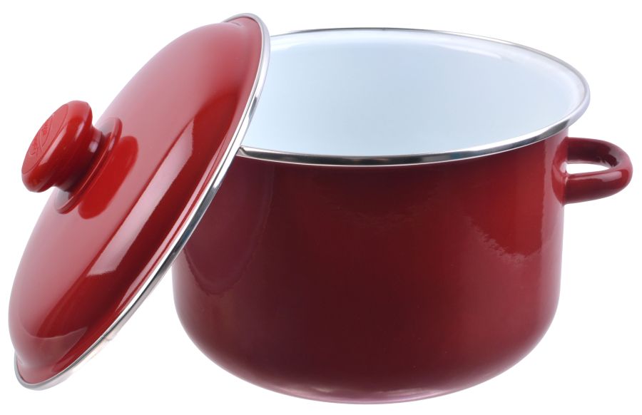 Кастрюля эм. 4л, эм. крышка с пласт. кнопкой, цилиндр с ободком, белая внутри, цвет вишня (8)