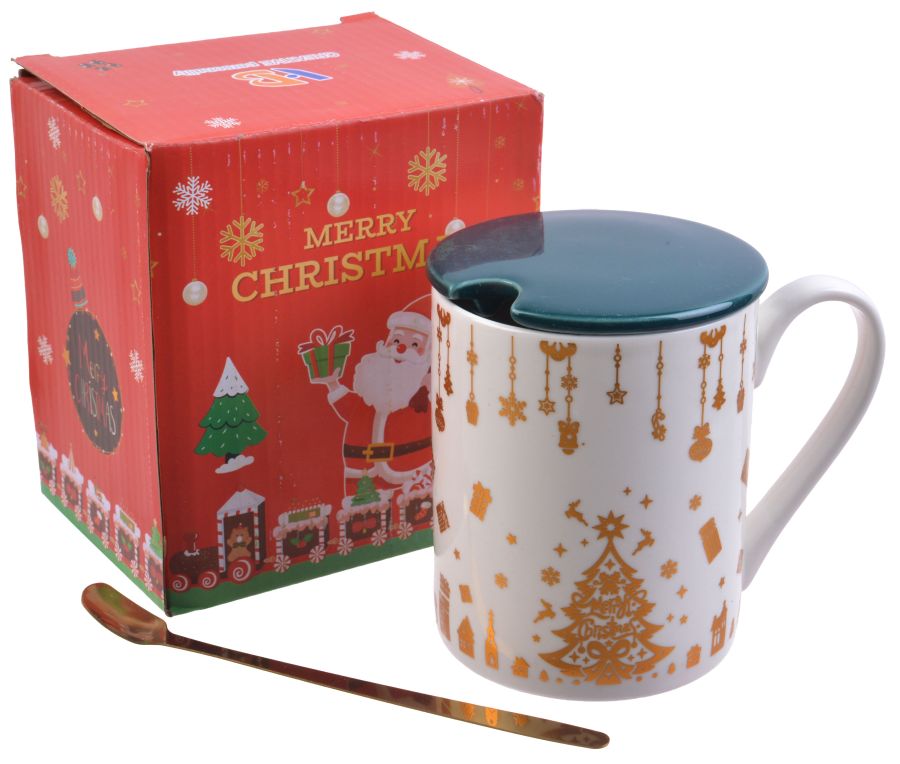 Кружка новогодняя с крышкой, ложка 300мл,керамика