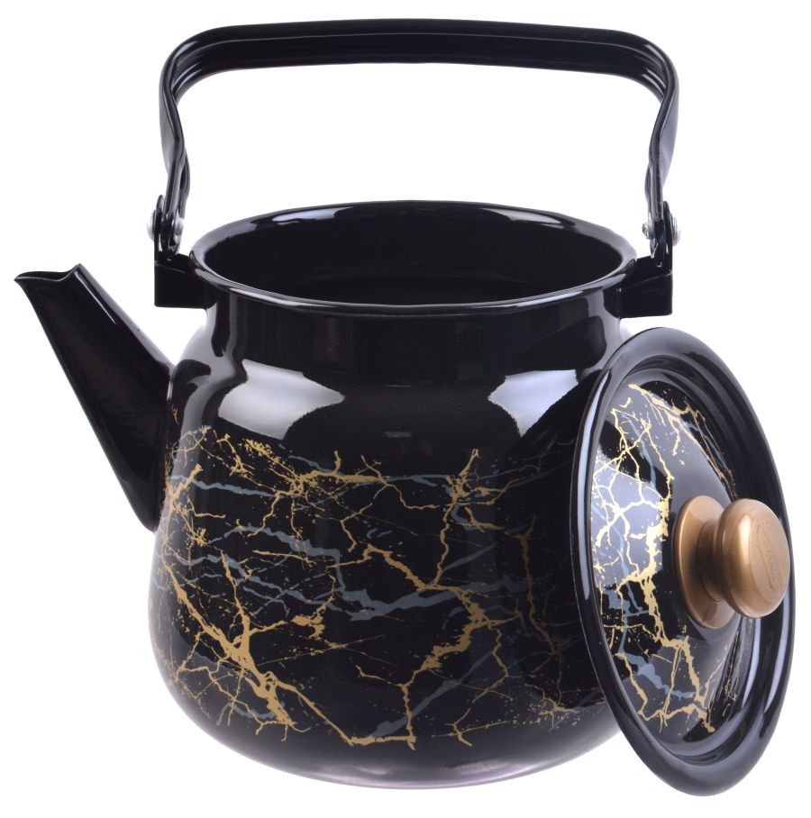 Чайник эм. 3,5л, эм. крышка с пласт.кнопкой, сферический, деколь "Мрамор золотой" черный (4)