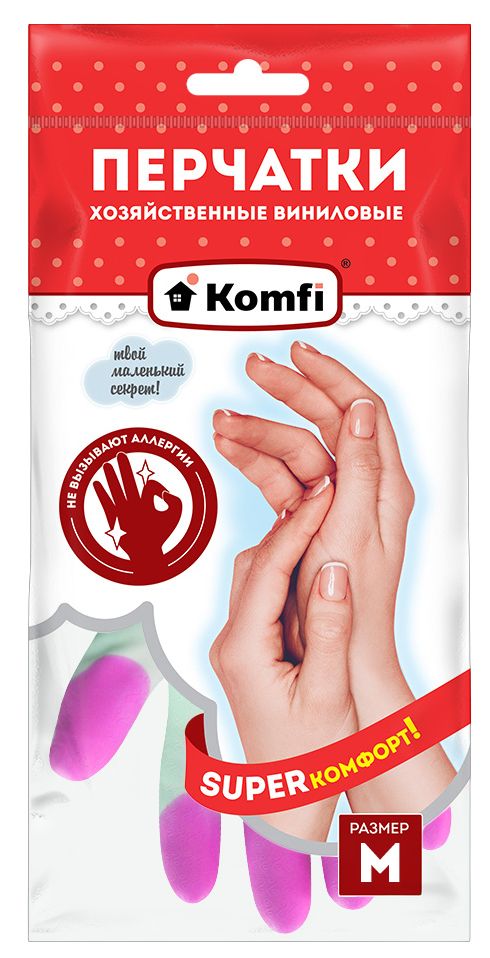 Перчатки хозяйственные виниловые размер M, без напыления, доп.слой на пальцах "Komfi" 3 цвета (12)
