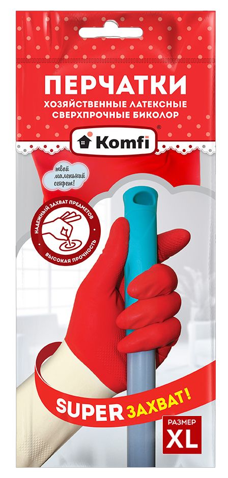 Перчатки хозяйственные латексные размер XL, без напыления, сверхпрочные, текстур. ладонь "Komfi"(12)