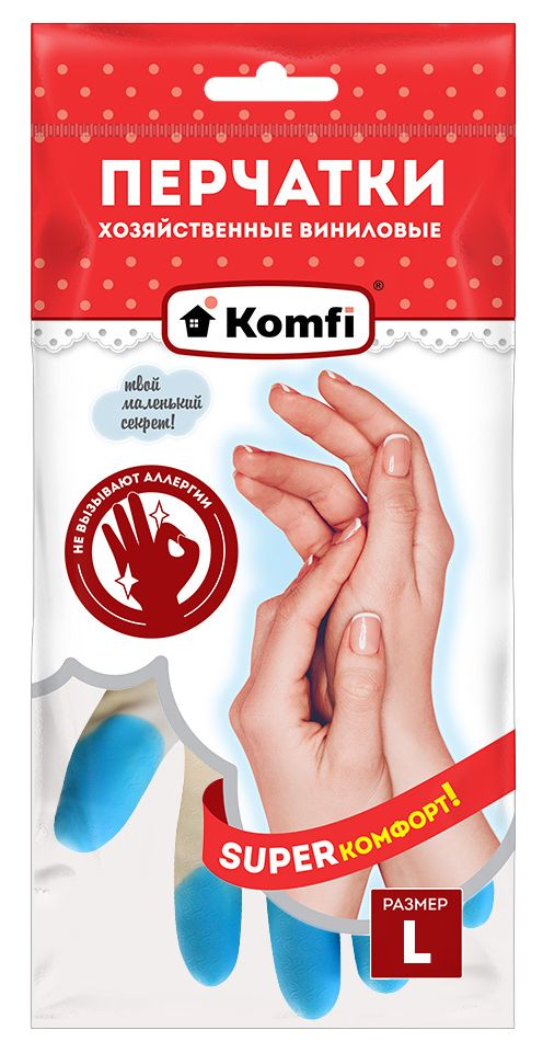 Перчатки хозяйственные виниловые размер L, без напыления, доп.слой на пальцах "Komfi" 3 цвета (12)