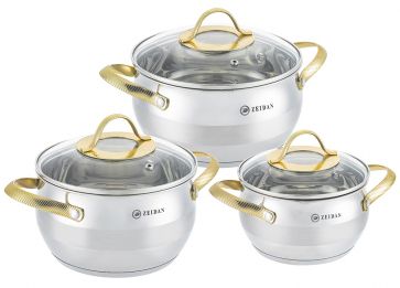 Набор кастрюль нерж. 3шт (1,9л; 2,7л; 3,6л), ст. крышки, ручки под золото, 3-слойное дно, индукция