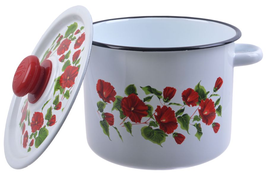 Кастрюля эм. 3,5л, эм. крышка с деколью и с пласт. кнопкой, цилиндр, деколь, белая