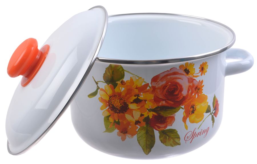 Кастрюля эм. 3л, эм. крышка с пласт. кнопкой, цилиндр с ободком "Весна" белая