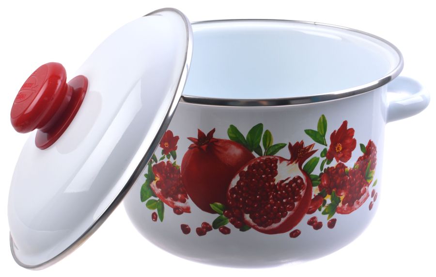 Кастрюля эм. 3л, эм. крышка с пласт. кнопкой, цилиндр с ободком "Гранатовый сок" белая