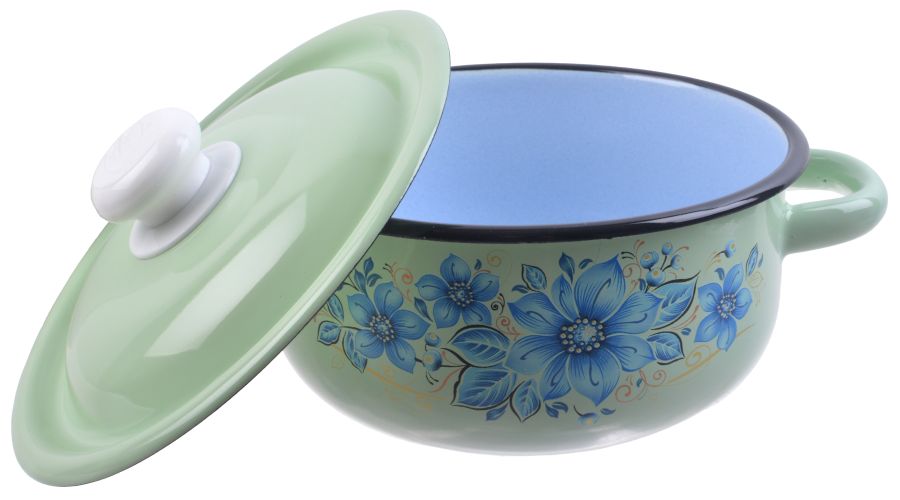 Кастрюля эм. 1,5л, эм. крышка с пласт. кнопкой, цилиндр, деколь микс, салатовая