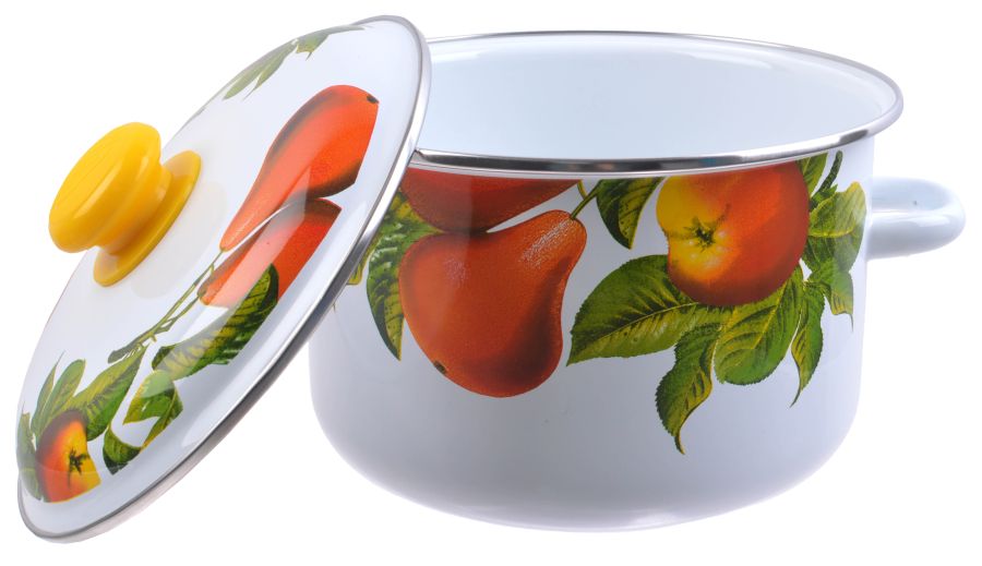 Кастрюля эм. 4л, эм. крышка с деколью и с пласт. кнопкой, цилиндр с ободком "Дары лета" белая