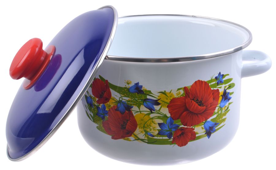 Кастрюля эм. 3л, эм. крышка кобальтовая с пласт. кнопкой, цилиндр с ободком "Майский день" белая