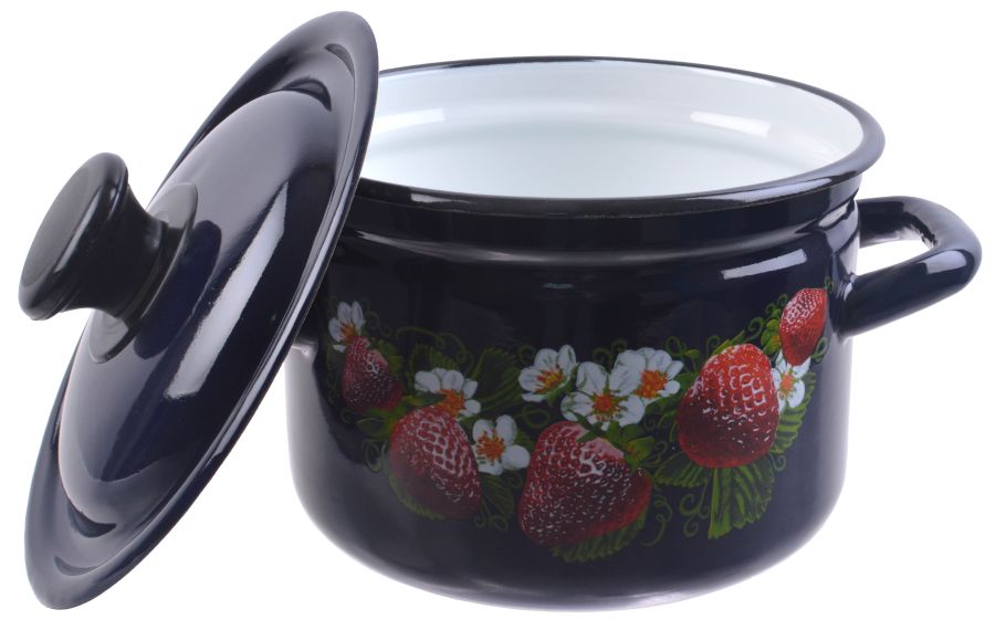 Кастрюля эм. 2л, эм. крышка с пласт. кнопкой, цилиндр, деколь микс, бостон (синяя)