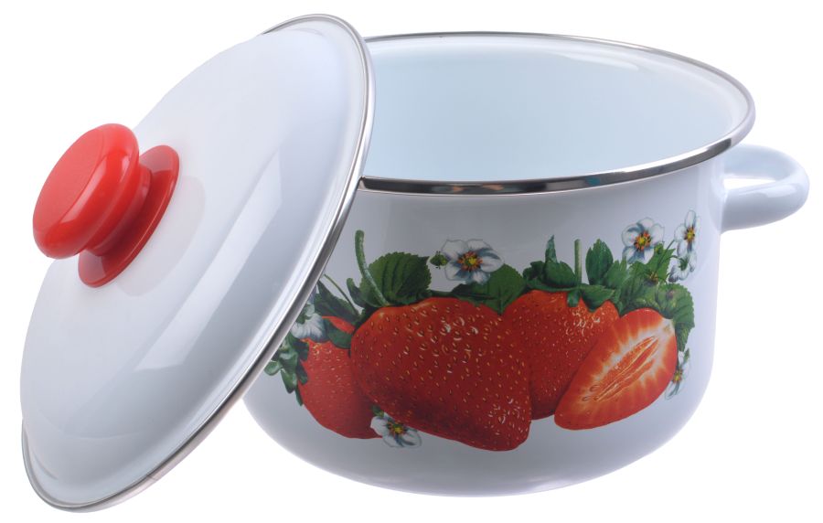 Кастрюля эм. 3л, эм. крышка с пласт. кнопкой, цилиндр с ободком "Клубника садовая" белая
