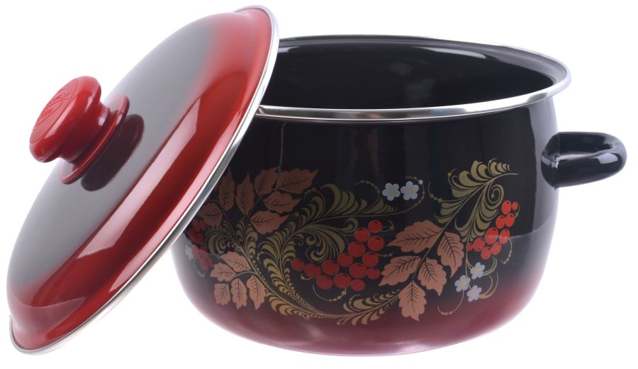 Кастрюля эм. 4л, эм. крышка с пласт. кнопкой, сфера с ободком "Рябинушка" красно-черная