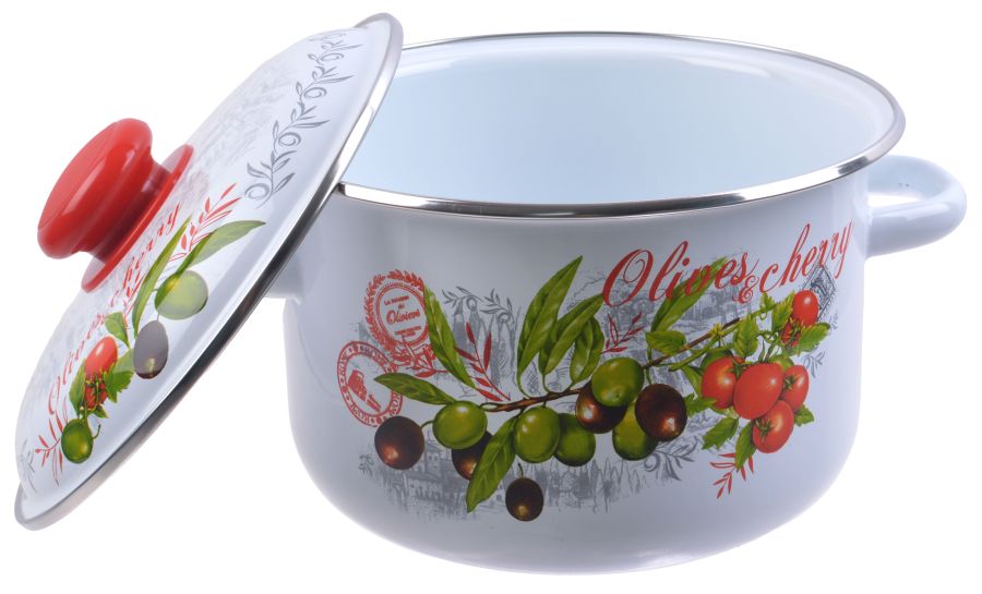 Кастрюля эм. 3л, эм. крышка с ободком, цилиндр "Оливки и черри" белая